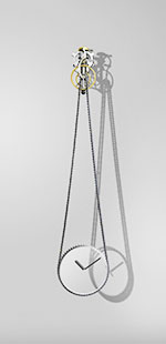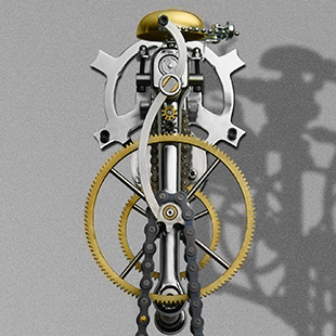 Not only standard bicycle chains are used but also the basic bicycle components as a crankshaft, spokes and a real old fashioned bell that will ring start every hour with a discreet high ring tone. The TimeMachine is not driven by a spring or a weight, but by a small, silent 110 Volt 60Hz synchronous motor that therefore always runs exactly on time.