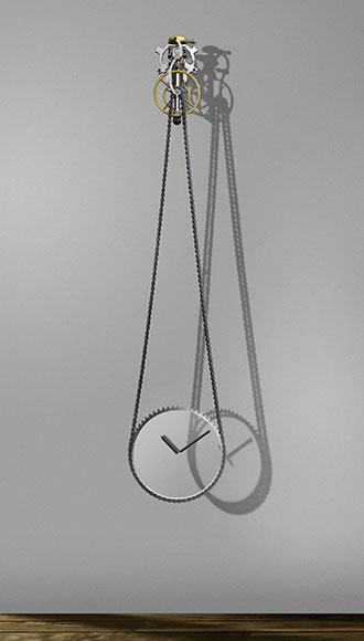 The TimeMachine, a wall-hung clock designed by artist Maarten Kraanen from recycled bicycle parts, distills formal and technical complexity into a clear, simple-seeming structure. (And while Kraanen's original clock of this type now is in a clock museum in Utrecht, his design continues in the mini-production by the artist and a helper, so the ticker you are seeing here is one of those.)